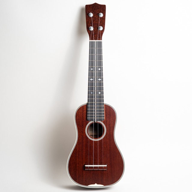 1910〜20年代、Martinがボストンの楽器販売会社Oliver Ditsonのリクエストに応える形で製作していたドレッドノート型のソプラノウクレレをモチーフに、カルチベイトウクレレならではのアレンジを加えた当店オリジナルのソプラノウクレレです。 長野県松本市にある当店が企画し、お隣の長野県塩尻市にあるT's Guitars (ティーズギター)さんで製作していただきました。 <仕様について> ナット幅35mm、スケール345mm、一般的なMartinタイプのソプラノウクレレです。 ディットソン型のボディは、通常のFigure 8 (数字の8)型のボディに比べてくびれが少なく、ボディ内容積が増えることでFigure 8 型よりも中低域が豊かでふっくらとした音色になる特徴があります。 ボディはアフリカンマホガニー単板、ネックもアフリカンマホガニー、指板はローズウッド、ブリッジはパーフェロー、ナット&サドルはデルリン。 パッと見た印象はヴィンテージな雰囲気ですが、演奏性・操作性はしっかりと現代的に使いやすくアップデートしてあります。 具体的には ◎1F付近が極端に薄い本家(ヴィンテージMartin)よりも1mmほどネックが厚くなるように設計してあり、握りの安定性を向上。 ◎本家は12フレットまでしかありませんが、3弦開放のド(C4)から2オクターブ上のド(C6)まで一応出せるように指板を15Fまで延長。 ◎セーハなども少ない力でしっかり押弦できる背の高いフレットを選択。 ◎低めの弦高は弾きやすい反面、音にハリがなくなってしまいがちなのですが、弾きやすい低い弦高でもしっかりと粒だちの良い音が出る設計。 ◎ハイフレットでも正確な音程で美しいハーモニーが出せるようにオフセットサドルを採用。 ◎音程面で有利なフロロカーボン弦を使いたくて、でもフロロのキンキンしがちな高音域をマイルドにしたくて、ナットサドルには一般的な牛骨ではなくデルリン(ポリアセタール)を選択。 ◎使い勝手を重視して、チューニングが快適なゴトーUPTペグを搭載。見た目や重量を考えてウェーバリーのフリクションやペグヘッズも候補にあがりましたが、コストと使いやすさを考えるとこのモデルにはUPTがベストと判断しました。 <装飾について> 本家同様にロゼッタの飾りのみのシンプル仕様。極力装飾をなくして価格を抑えました。 本家のStyle-0は7Fのポジションマークがシングルですが、ダブルに変更。指板上のマークは極小サイズですが、指板サイドにもポジションマークが入っていますので演奏時の視認性は問題ありません。 <塗装について> 1920年代のヴィンテージ3Mのようなやや赤みのある茶色に着色した、極薄のトップラッカー・セミグロス仕上げ(グロスのようにテカテカではなく、かといって艶消しほどマットではない見た目)となっております。 「極薄」というのは、楽器の鳴りを妨げないよう塗膜を極力薄くするため、下塗りと目止めをして上塗りのラッカーを吹きっぱなしにしてあるということです。 デメリットとしては、塗装面が鏡面仕上げのようにフラットではなく、導管部分が目痩せ(塗料が木の凹凸に沈みこむこと)により若干凸凹して見えたり、まれに目止めが道管を完全に埋められずピンホール(塗膜に穴が開くこと)になったりすることがあります(このあたりはヴィンテージ感のある仕上げということでご理解のうえご購入をお願いいたします) <弦について> 弦はこのウクレレの魅力を最大限に引き出すため、特別に組み合わせたオリジナルゲージのフロロカーボン弦を採用しています。細めなので弦を押さえやすく(=弾きやすい)、楽器がよく響きます。細めの弦はオクターブピッチも狂いにくいので、音程の面でも有利です。フロロ弦はナイロン弦に比べて温度変化によるチューニングの狂いも少ないので、扱いやすいというメリットもあります。 一般的に無機質でケミカルな印象の強いフロロカーボン弦ですが、このセットは比較的ナチュラルでオーガニックな音色になっています。 <音色や弾き心地について> マホガニーのソプラノウクレレらしいコロコロとした素朴な音色で、低音域がすっきりしていて明るく軽やかな音質が特徴です(太い音だったり、迫力のある低音を求める方には予算が許せばSeilenやSUMI工房といった個人製作家さんの楽器をおすすめします) 重量も約340gと軽量で抱えやすく、音も軽やかに鳴ってくれます。ジャカジャカ弾いて良し、しっとりとソロスタイルも結構いけるソプラノウクレレに仕上がったと思います。 弾きやすいネックやフレットの形状、フレット端のエッジ処理、正確な音程でハイフレットでも気持ちよく弾ける、ヴィンテージMartin Style-3のような赤みがかったマホガニー色の見た目などなど、予算内でできることはすべてやり尽くしました。 いくら音色が良くても、いくら見た目がかっこよくても、弾きにくい楽器は自然と手が遠のくものです。弾いていてストレスの少ない楽器というのはそれだけでとても価値があるものだと思います。 これまでたくさんのウクレレを