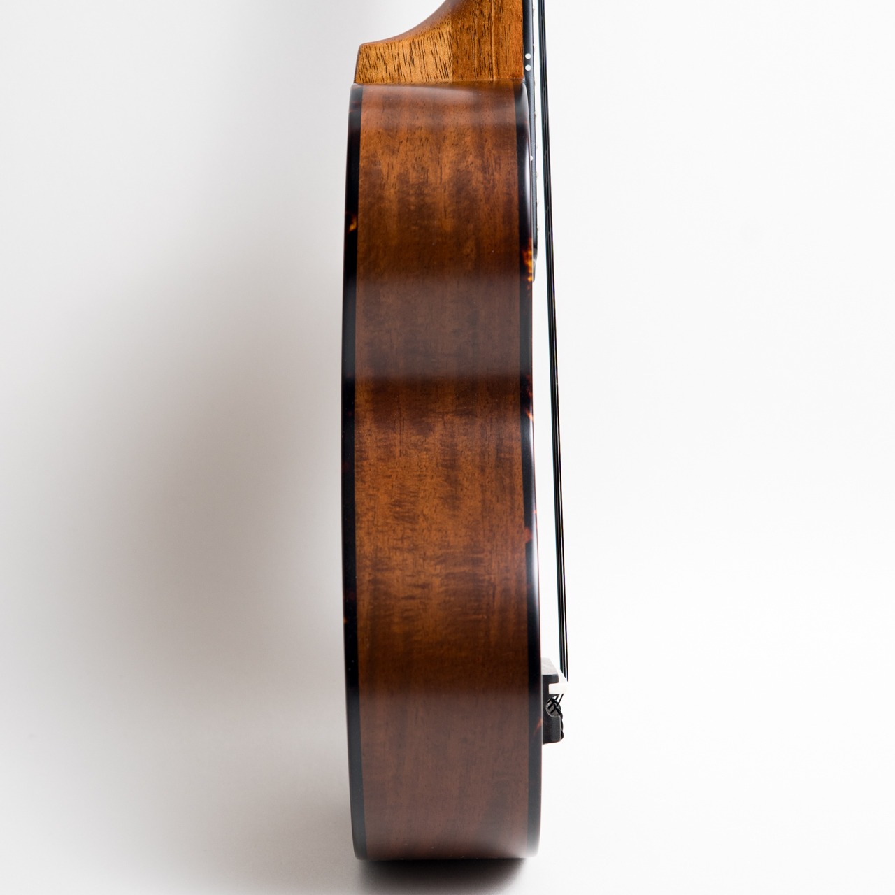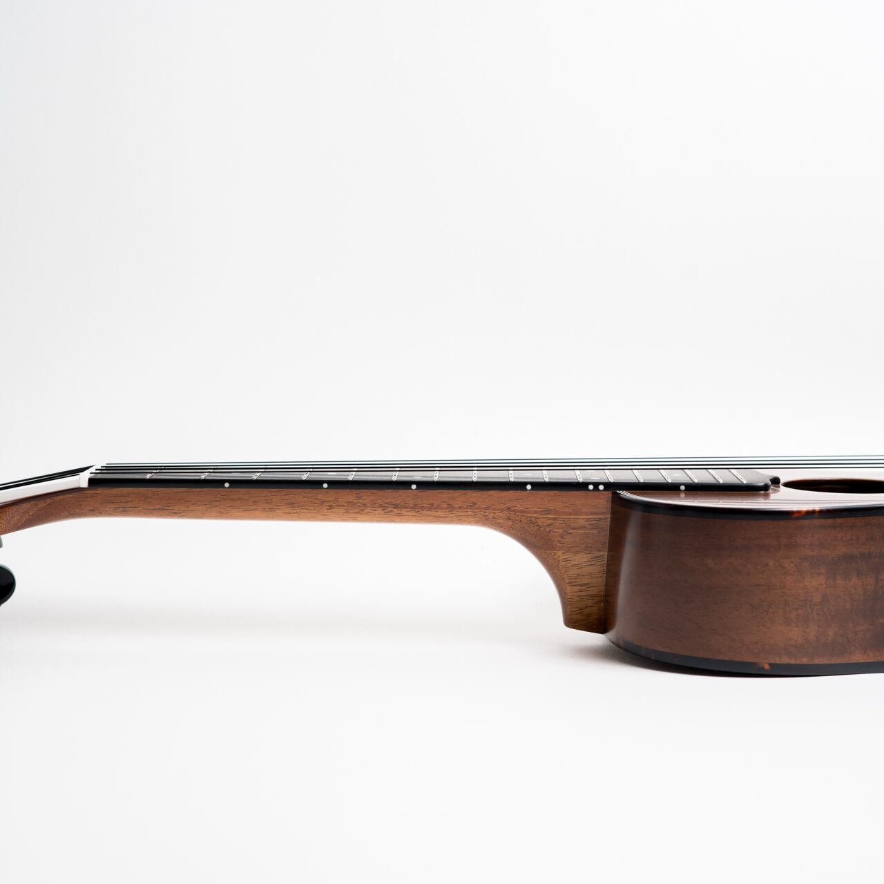 こちらのウクレレにはとても貴重なハワイアン・ミロという木材をボディに使用しております。ウクレレ材の定番であるハワイアンコアと同じくハワイの木で、コアよりも木質が緻密で比重も重く、濃い茶色の色味が特徴です。