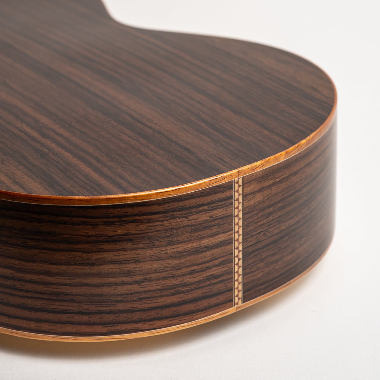 ロゼッタとボディトップのパーフリングにはアバロンの装飾が施されていますが、派手すぎずシンプルで洗練されたデザイン。パーフリングにはさりげなく鮮やかなブルーのラインも入っていて、これがなんともおしゃれな印象を与えてくれます。