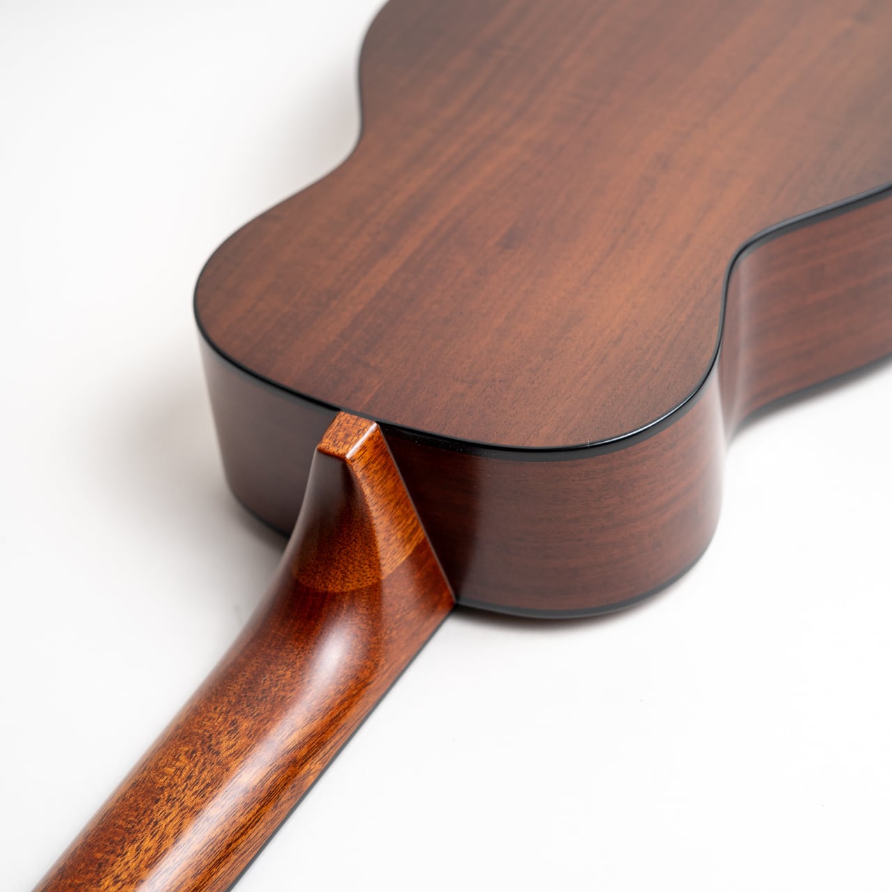 発音はとってもクリアなんだけど、音の角が丸くてキンキンすることがなく、キメの細かい材質らしい滑らかで繊細な音色がします。コンサートサイズなので音量やサスティーン、低音にも余裕があって、地味な見た目のミロ材ですが倍音がとても豊かですごくリッチな音色です。前回入荷したミロコンサートはローズウッド指板だったのですが、今回指板材をエボニーにしたことでひとつひとつの音がより明瞭に、はっきりとしています。
