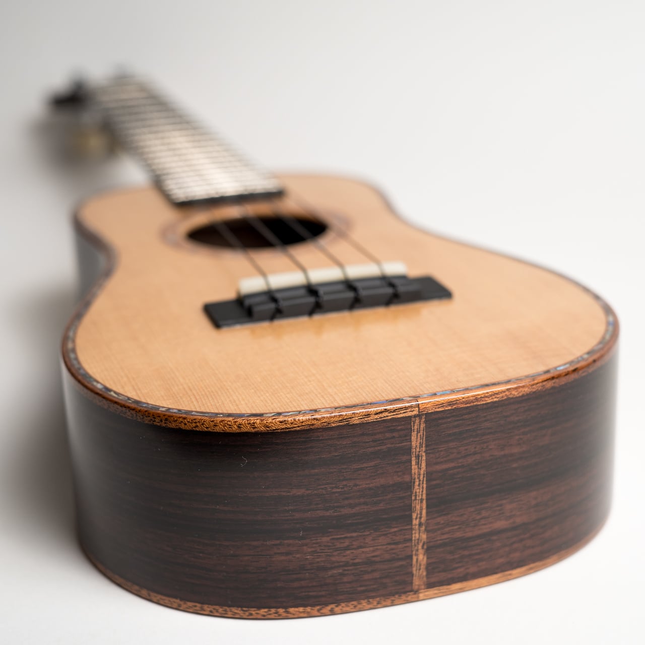 今回入荷したコンサートウクレレは、ボディ材がアコースティック・ギターでは王道のシトカ・スプルース&インディアン・ローズウッドという組み合わせになっており、エボニーの指板&ブリッジも相まって一見小ぶりなギターのような印象を受けます。