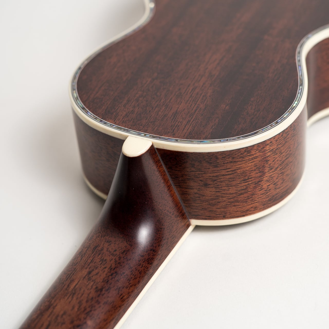 ボディには良質な1ピースのホンジュラスマホガニーを使用。ネックにもホンジュラスマホガニーを使用。ブリッジもホンジュラスマホガニーで、指板はエボニーです。