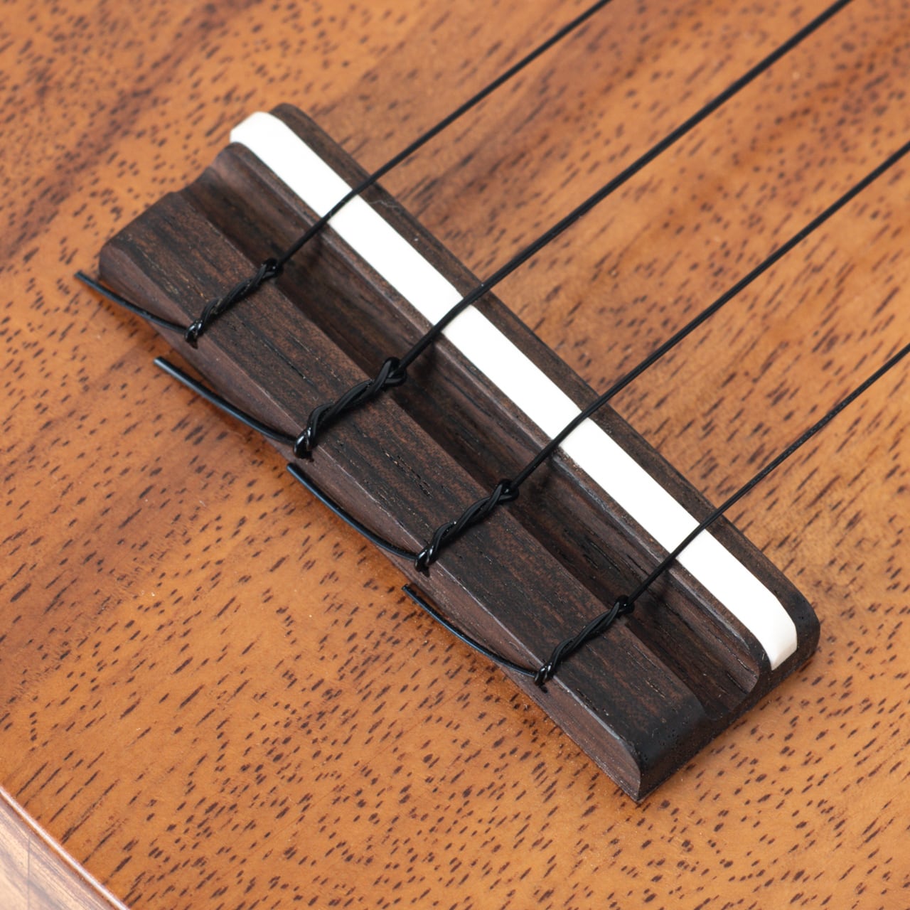 こちらのウクレレは、ユニークな杢目のハワイアンコアをボディの表裏にワンピースで使用したヴィンテージスタイルのソプラノウクレレです。通常はボディの中心で2枚を接ぎ合わせて表板と裏板を作りますが(=ブックマッチ)、今回はよりヴィンテージの雰囲気が出るように1枚の板で製作していただきました。