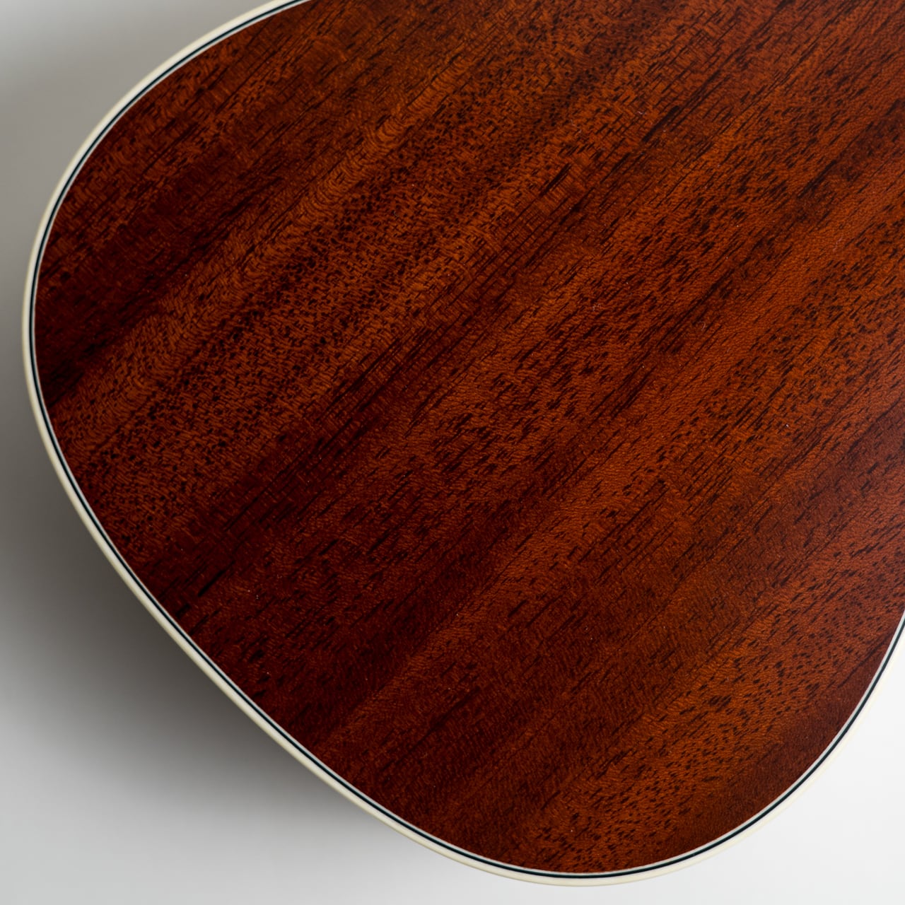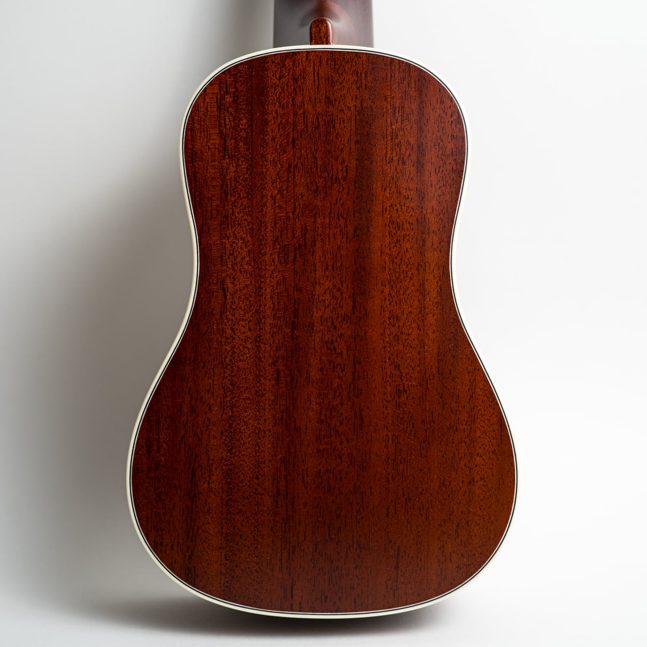 ボディはホンジュラスマホガニーと同種のフィジーマホガニー単板。表板と裏板はブックマッチではなく贅沢に1ピースです。ネックはアフリカン・マホガニー、指板はエボニー、ブリッジはパーフェロー、ナット&サドルは牛骨。
