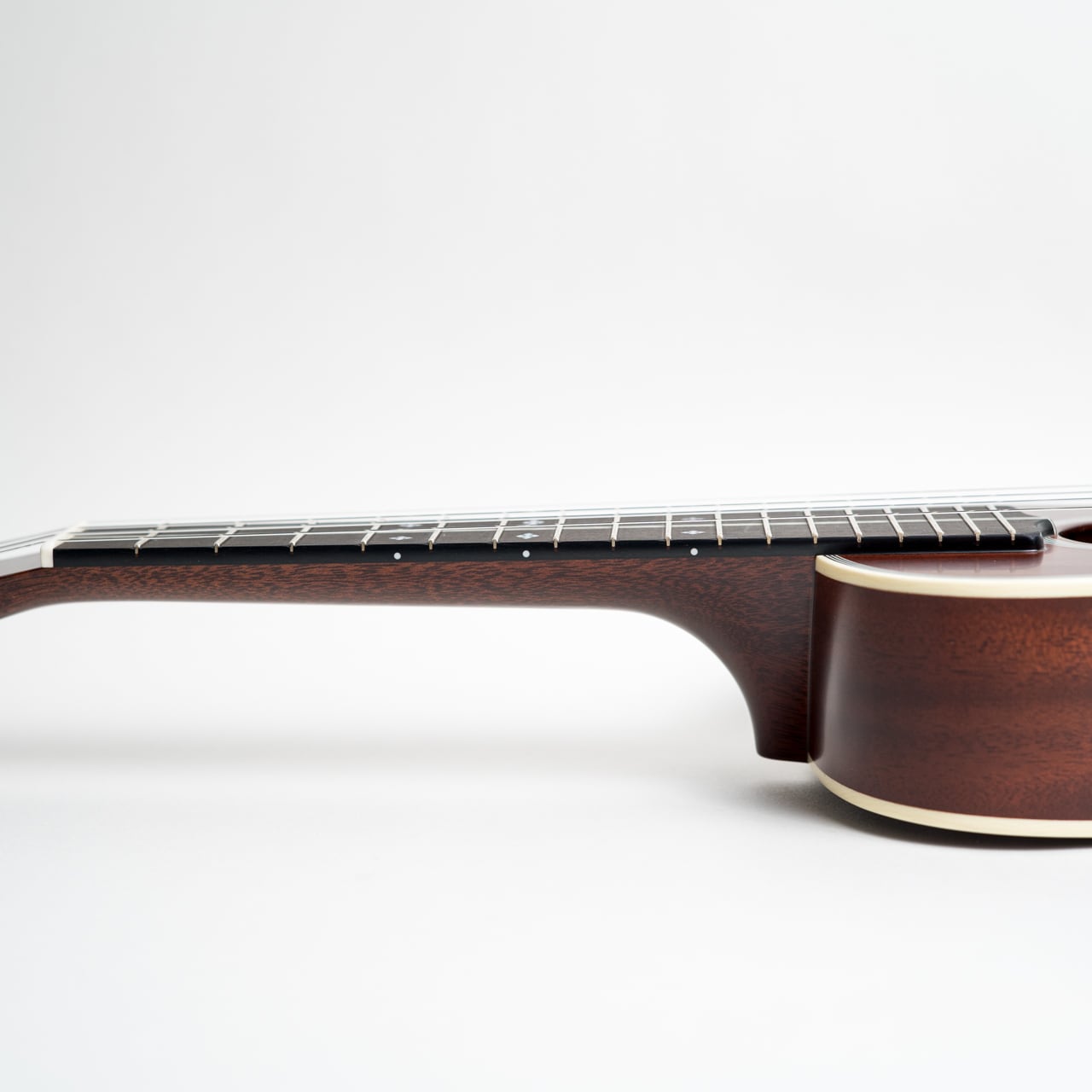 1920年代の Ditson Style-3 には切り欠きのない(ソリッド)ダイヤモンド&スクウェアのポジションマークが採用されていましたが、このモデルではあえて1936-1947年に採用されていた切り欠きのある(スロッテッド)ダイヤモンド&スクウェアのポジションマークを採用しました。